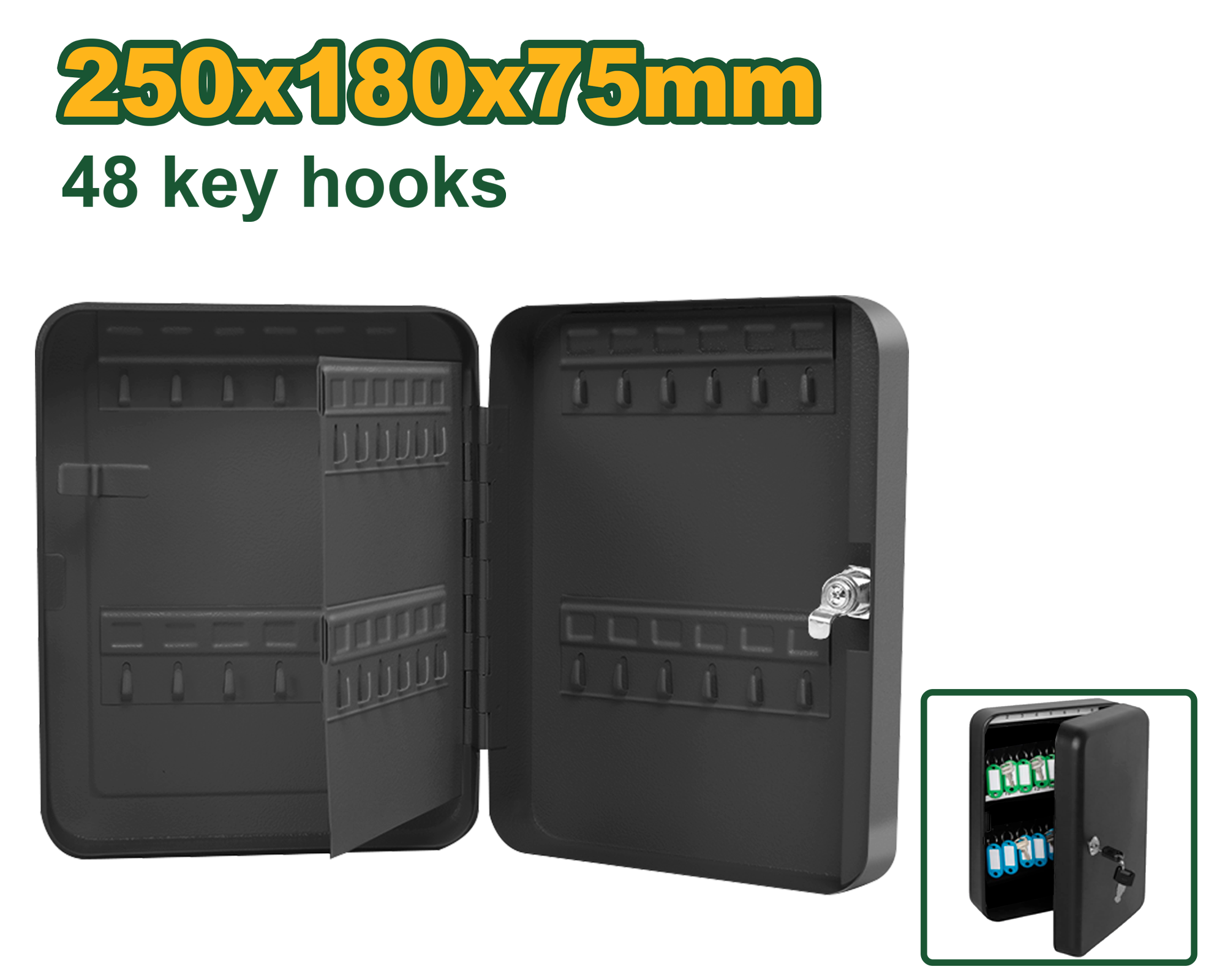 توفّر خزانة مفاتيح وسيلة آمنة ومنظمة لحفظ حتى 48 مفتاحاً، مما يجعلها مثالية للمكاتب والمحلات والمستودعات والمنازل. مصنوعة من صفيح ممتد بسماكة 0.7مم لضمان المتانة، ويمكن تثبيتها على الجدار أو الأرض، وتأتي مزوّدة بكل الإكسسوارات اللازمة للتنظيم.