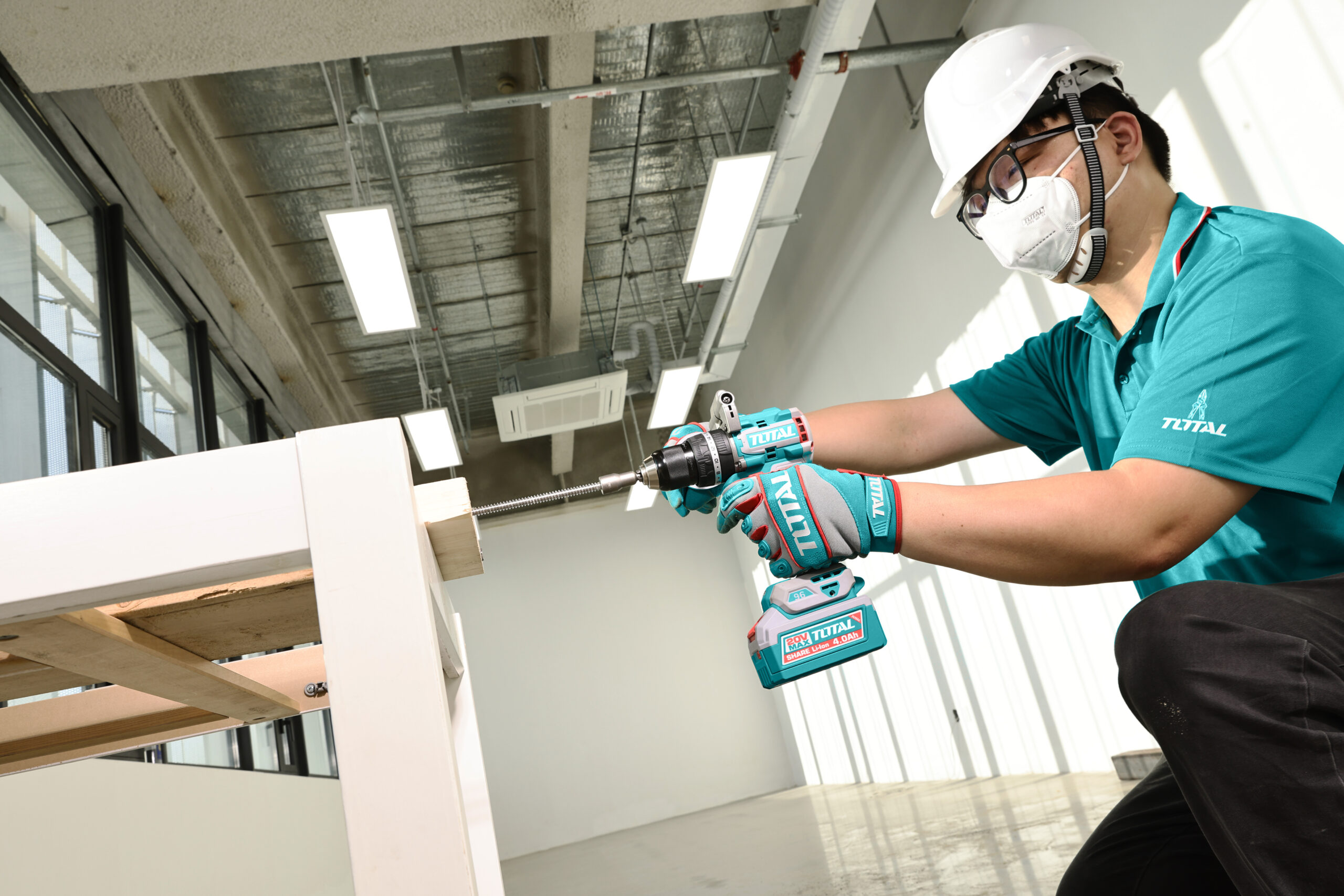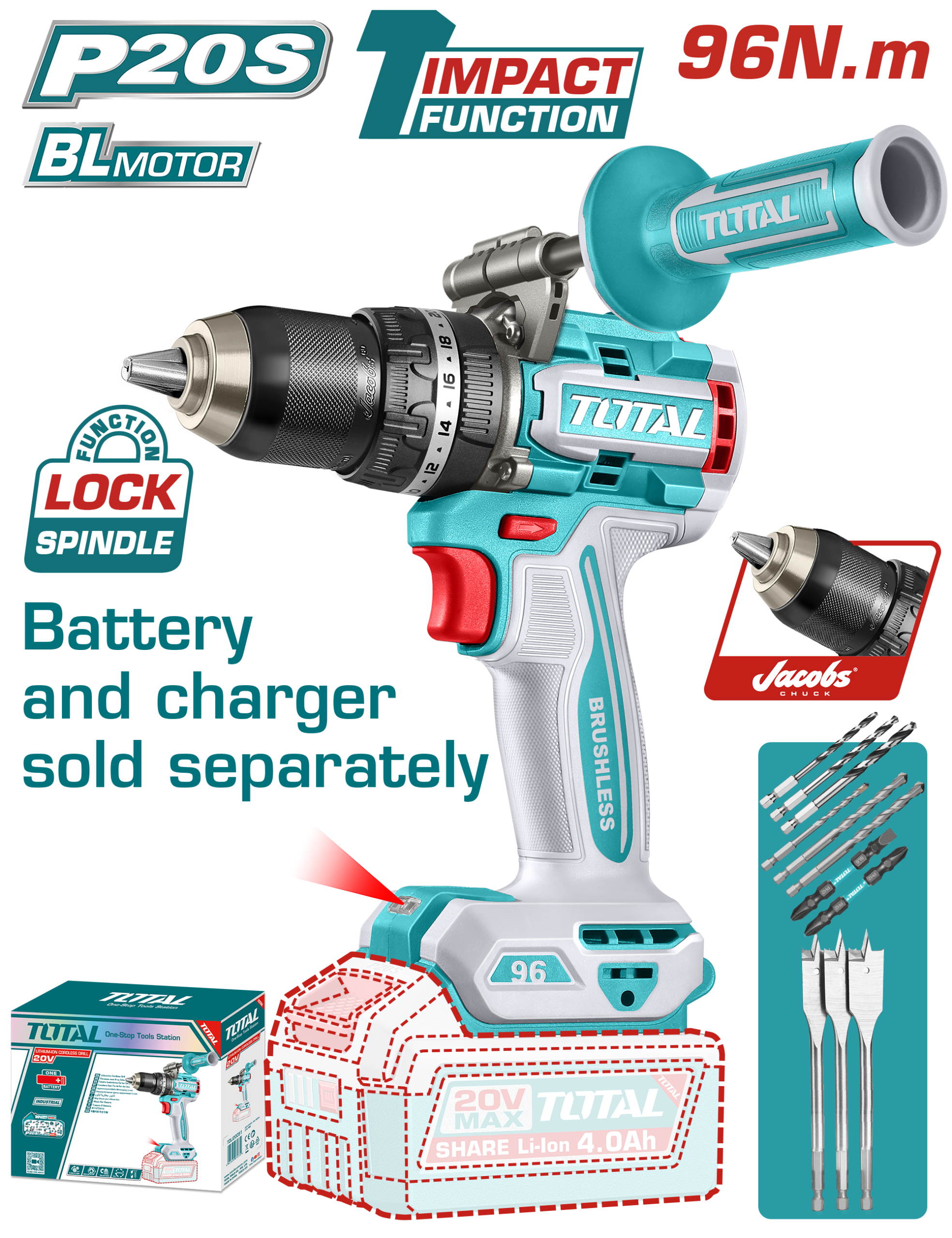 يحتوي الدرل على إضاءة LED مدمجة للعمل في الأماكن المظلمة، مع مؤشر LED لحالة البطارية لمعرفة مستوى الشحن. يأتي مع مجموعة متكاملة من الريش والإكسسوارات المناسبة للحفر في الخشب، الباطون، والحديد.