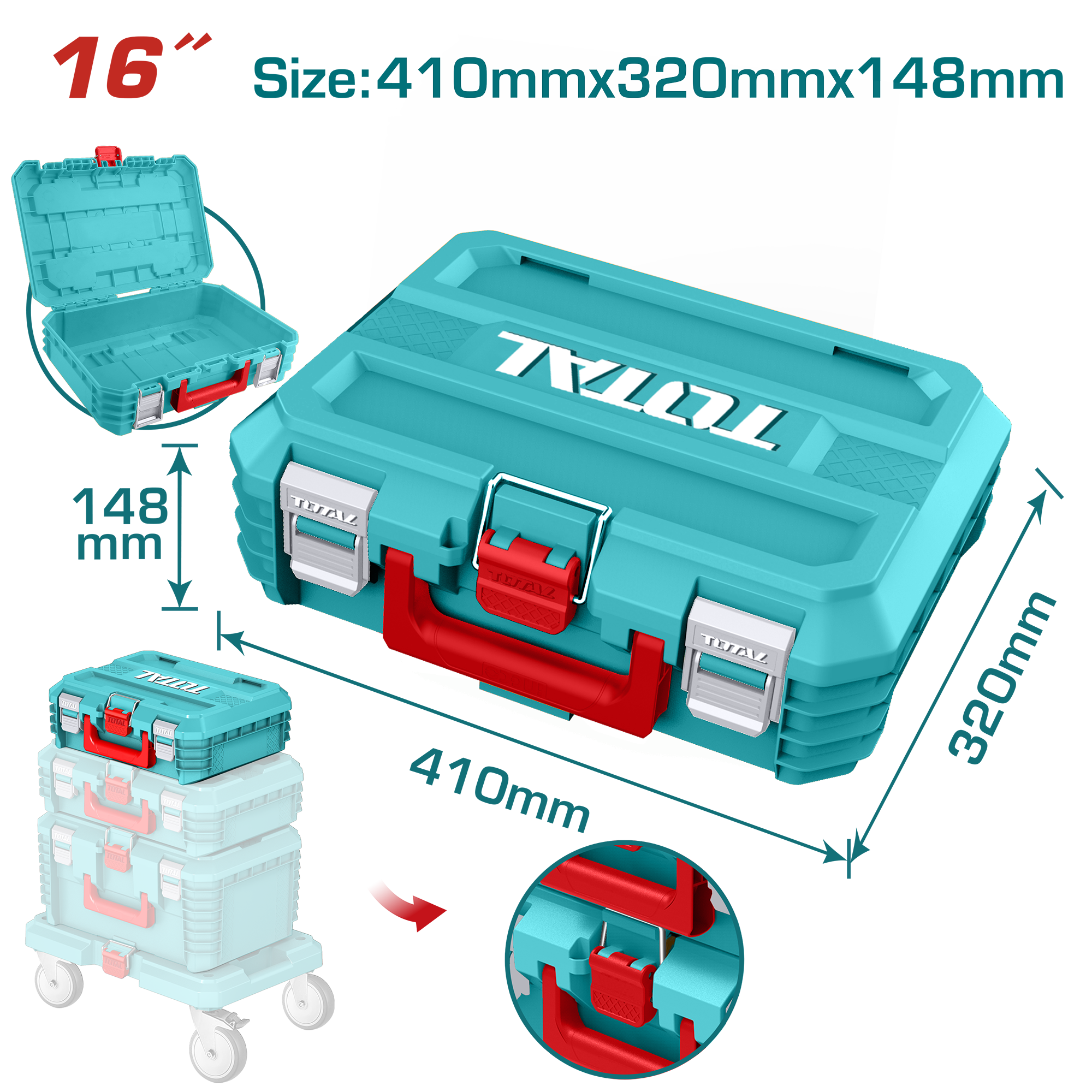 يُعد صندوق عدد قابل للتكديس 16 إنش مثاليًا لتنظيم الأدوات وحمايتها ونقلها بسهولة. مصنوع من بلاستيك PP عالي الجودة لمتانة وقوة تدومان طويلًا مع وزن خفيف. يتميز بتصميم قابل للتكديس لتوفير المساحة وسهولة التخزين، كما يمكن تركيبه مع قاعدة بعجلات (THTWB61001) أو عربة قابلة للطي (THWB61201) لنقله بسهولة.
