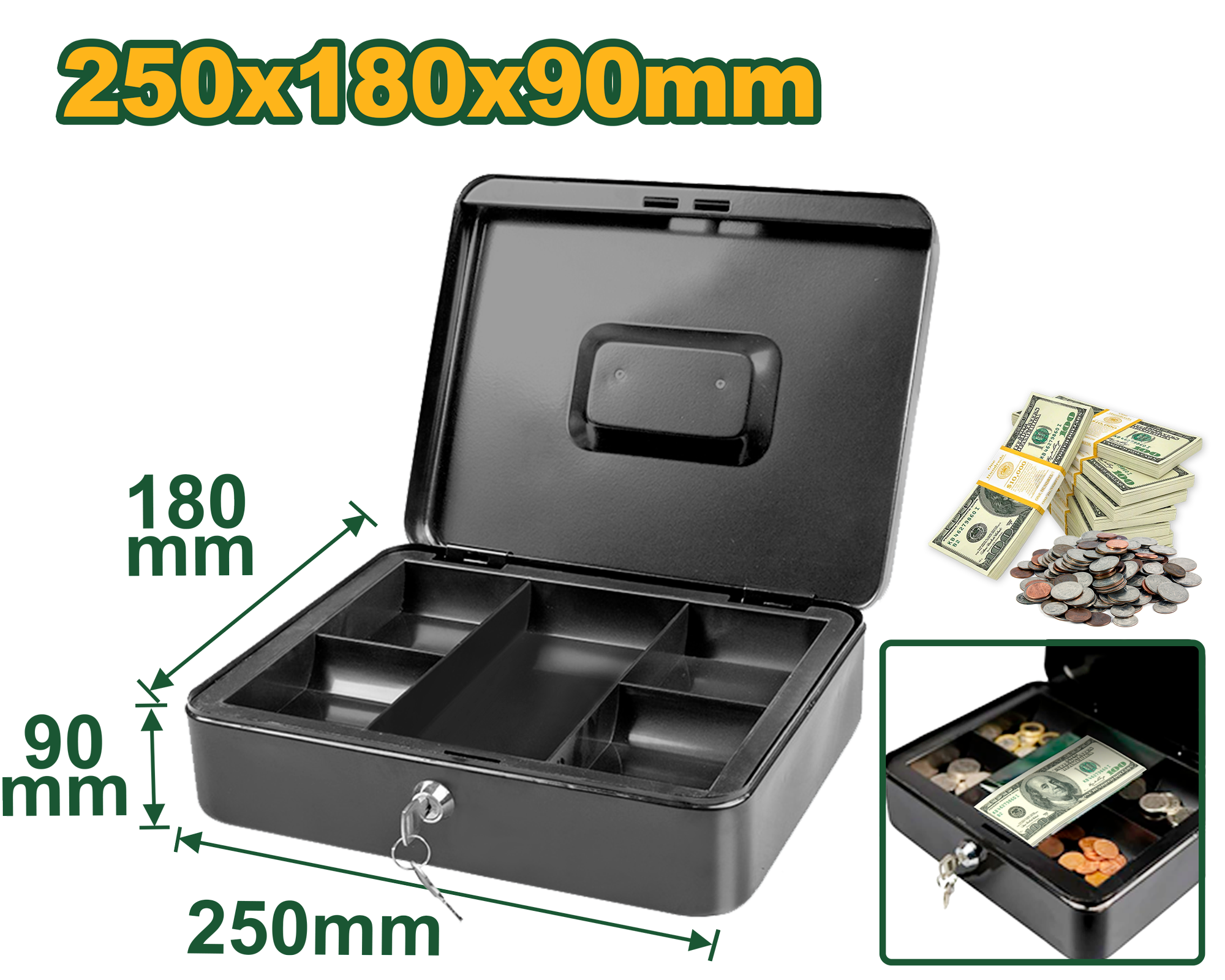 يتميز صندوق كاش بتصميم متين وآمن لحفظ النقود والعملات والشيكات والأغراض الصغيرة القيّمة. مصنوع من صفيح ممتد بسماكة 0.7مم، ويحتوي على 5 خانات داخلية لتنظيم المحتويات بسهولة، مع قفل مفتاح لضمان الأمان الكامل. مناسب للمحلات والمكاتب والاستخدام المنزلي.