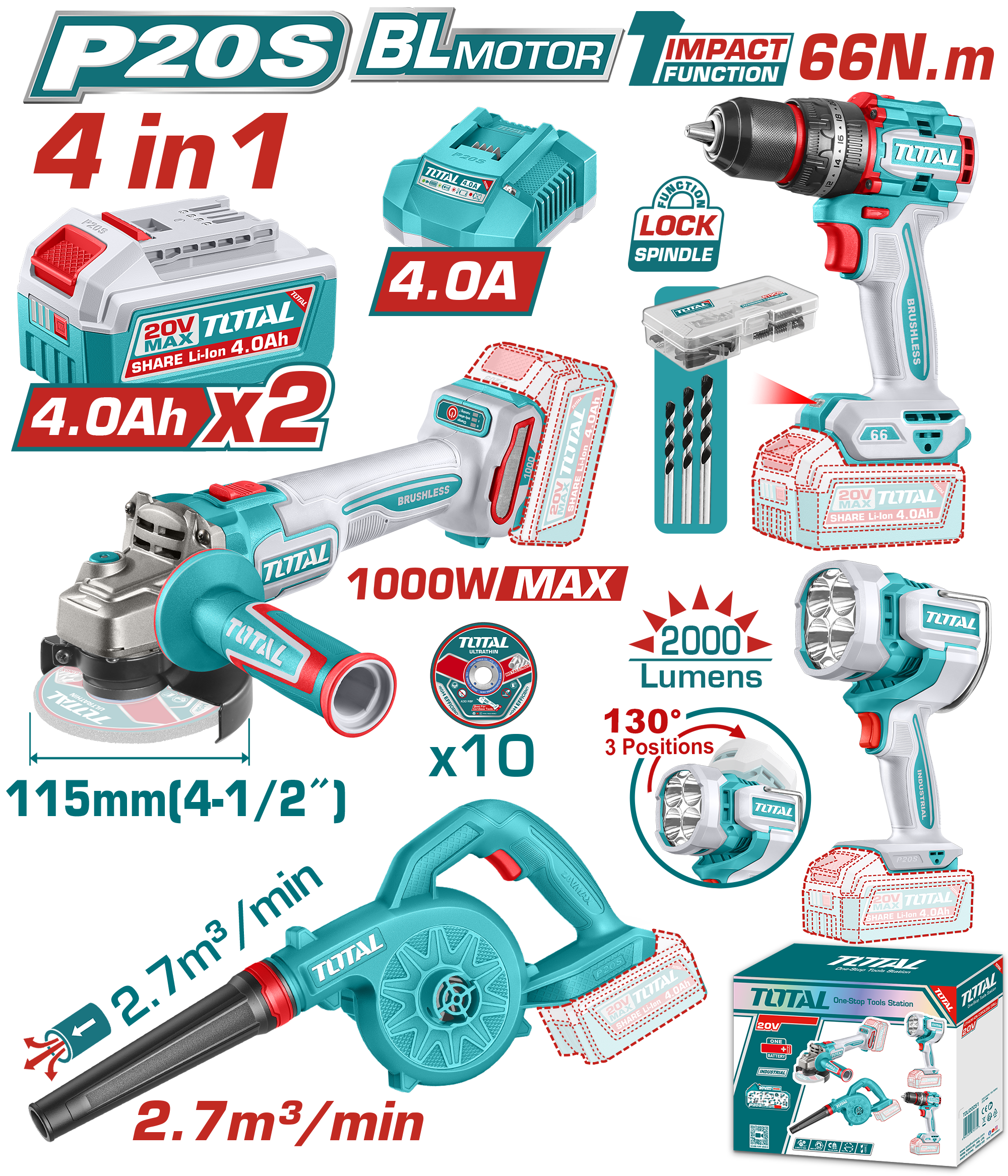 طقم أدوات شحن 4 قطع 20 فولت – صاروخ، درل، بلور و كشاف من توتال (TOSLI250993)
