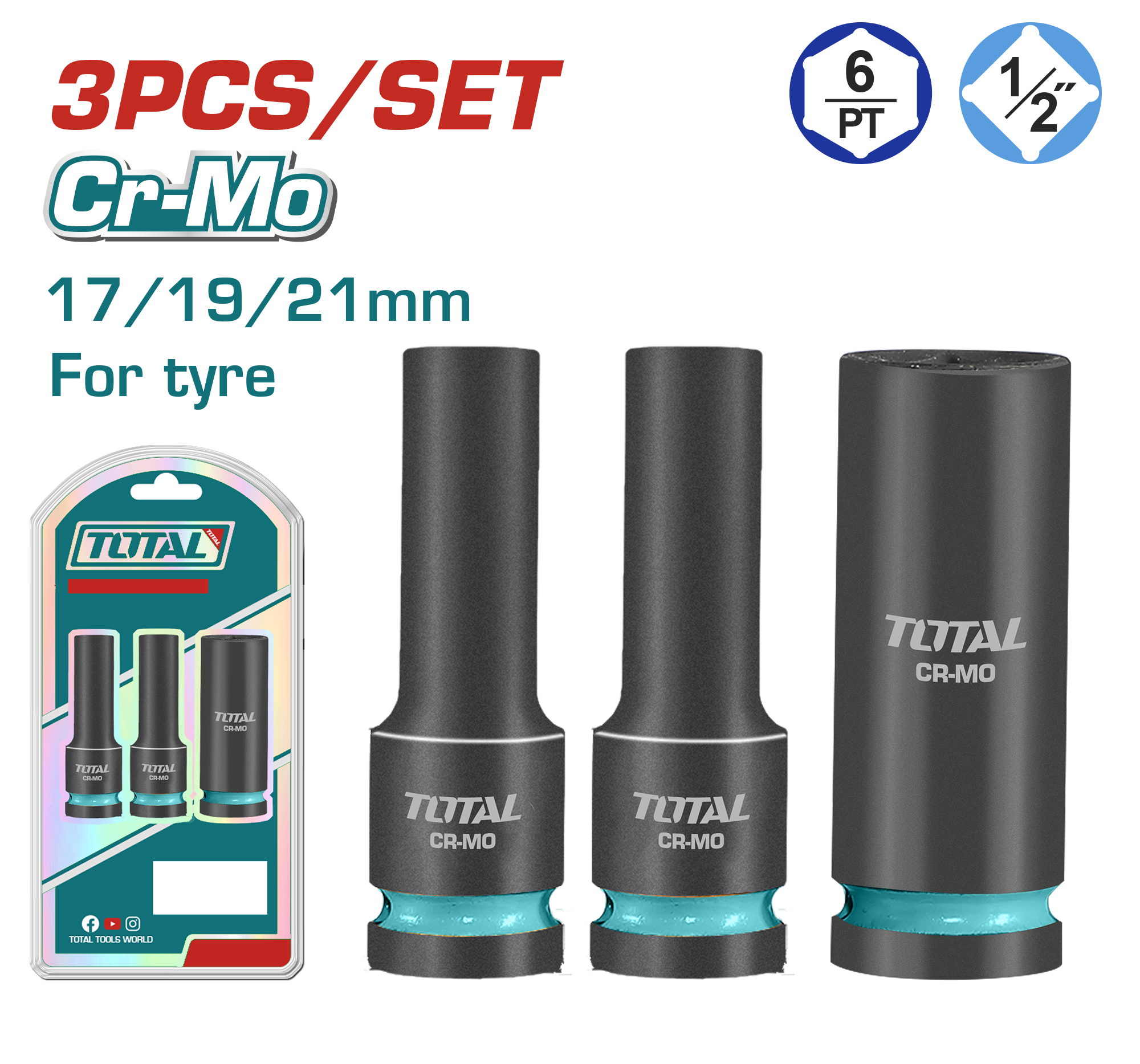 طقم بوكس طويل 1/2 إنش 3 قطع – 17 و19 و21 ملم من توتال (THKISD12042L)