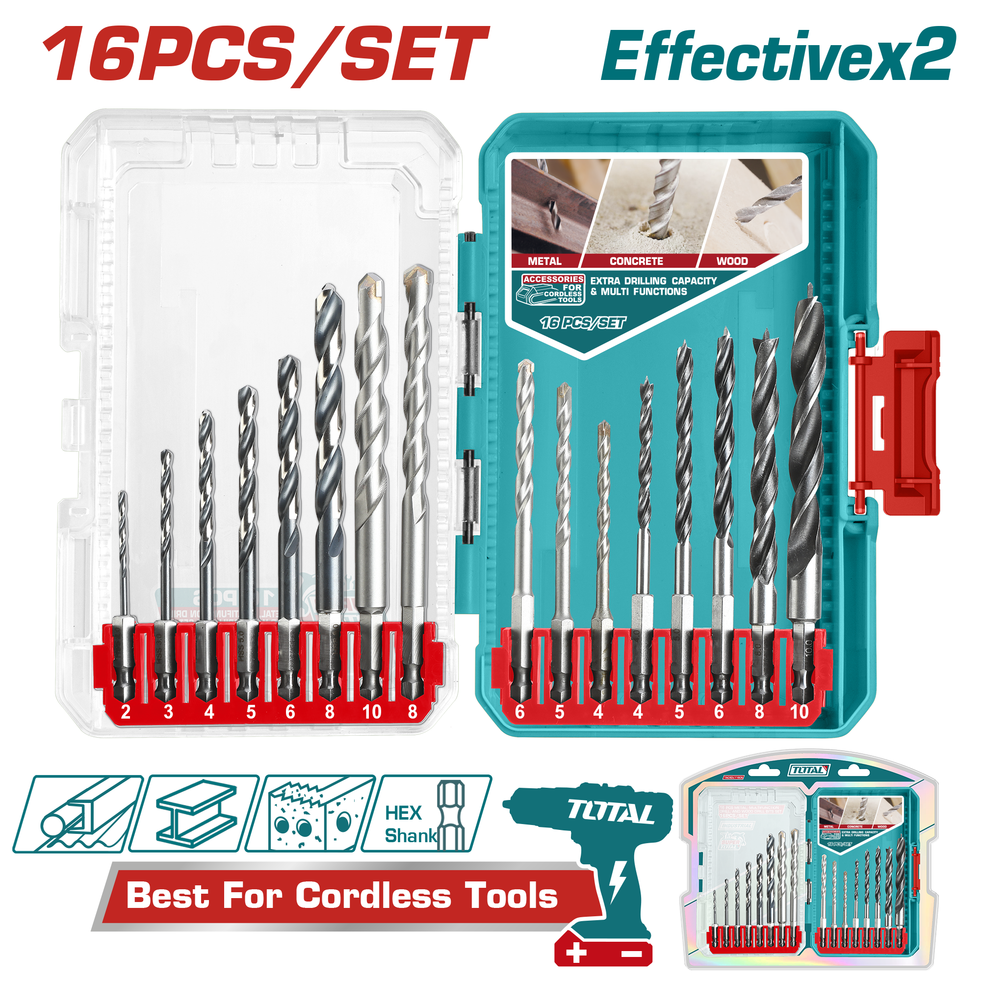 طقم ريش حفر 16 قطعة للحديد والباطون والخشب – سداسي من توتال (TACSDL11608)