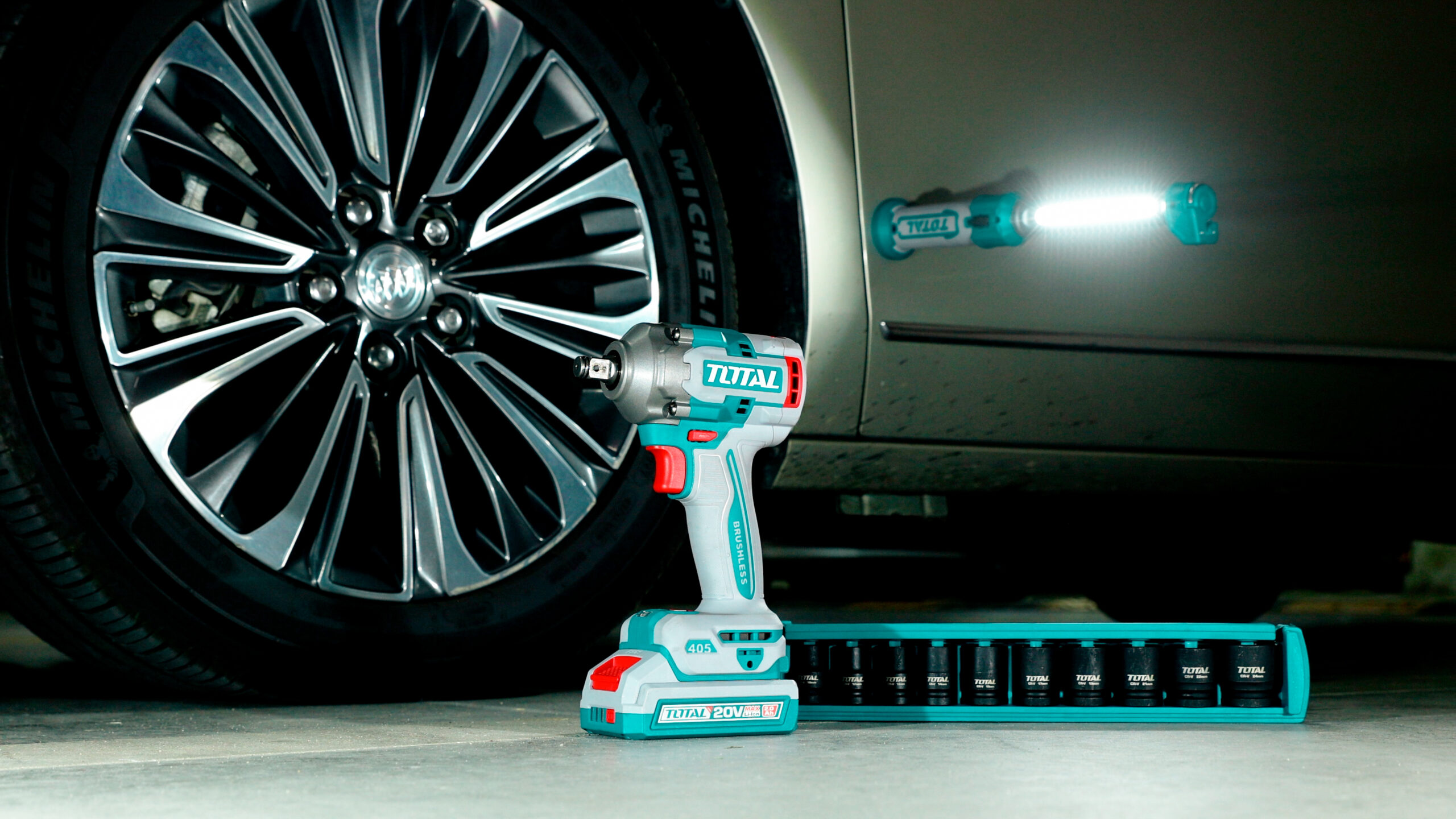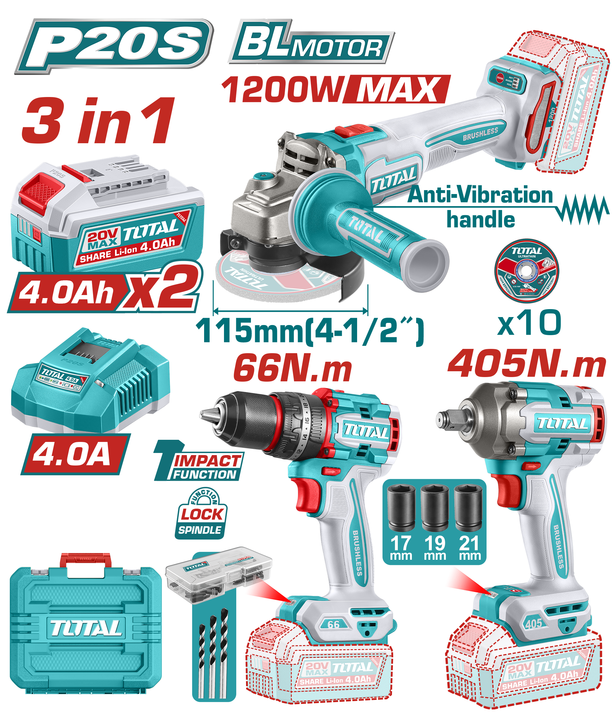 طقم عدة شحن 20 فولت 3 قطع بدون فحمات – صاروخ + درل + درل بوكس مع بطاريتين من توتال (TCKLI20358)