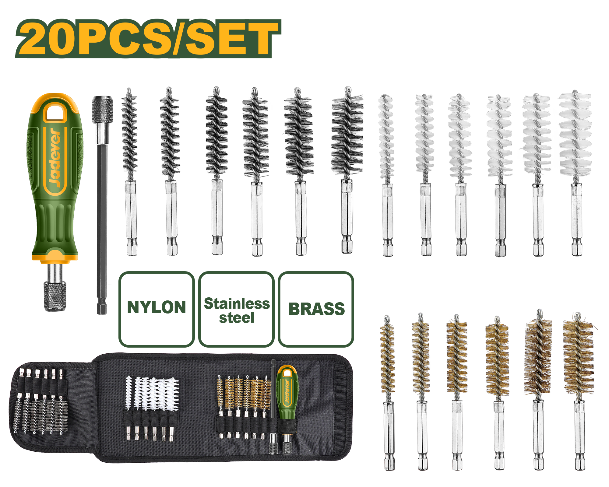 طقم فراشي تنظيف أنابيب 20 قطعة – نايلون وفولاذ ونحاس – مع وصلة من جادايفر (JDTB4520)