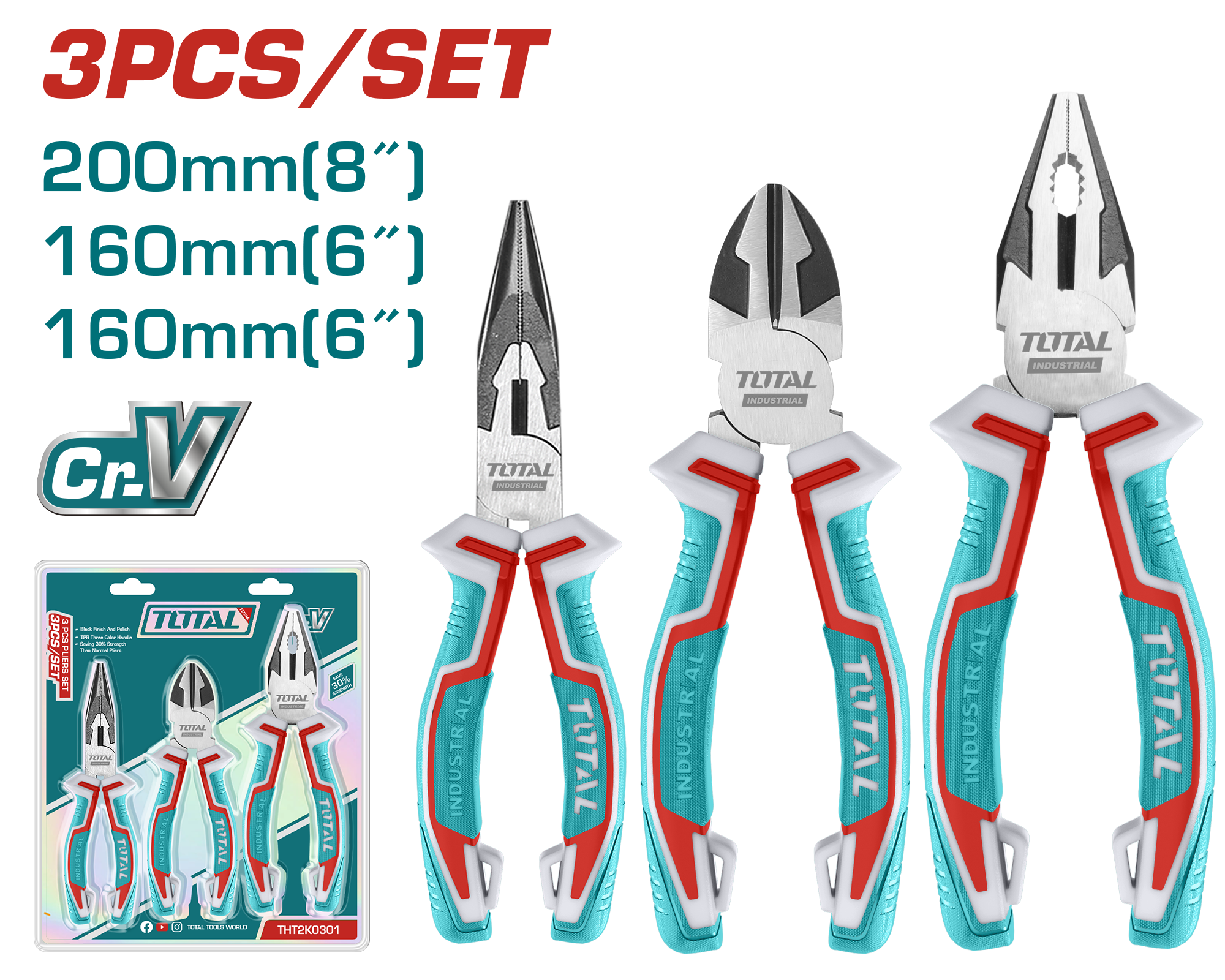 طقم كماشات 3 قطع عملي ومتين، مناسب للأعمال الكهربائية والميكانيكية والاستخدام المنزلي. مصنوع من فولاذ كروم فانيوم (Cr-V) عالي الجودة ليمنح قوة تحمل عالية وعمر استخدام طويل.