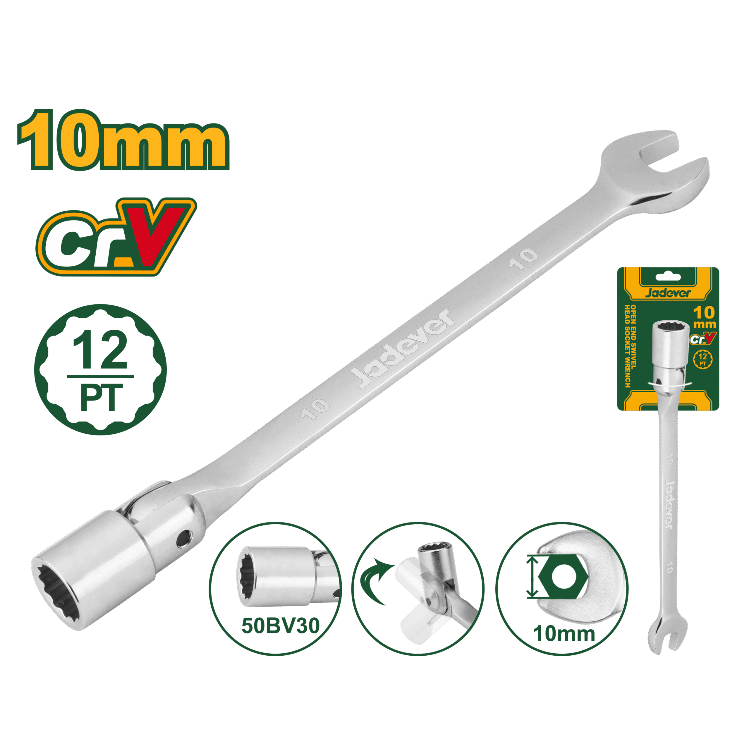 يوفّر مفتاح شق بوكس برأس دوّار 10مم مرونة عالية للوصول إلى الأماكن الضيقة، مع قوة ومتانة تجعل منه اختياراً مثالياً للاستخدام المهني والمنزلي. يتميز برأس 12 نقطة ومعدن قوي مطلي بالكروم لمقاومة الصدأ ولأداء يدوم طويلاً.