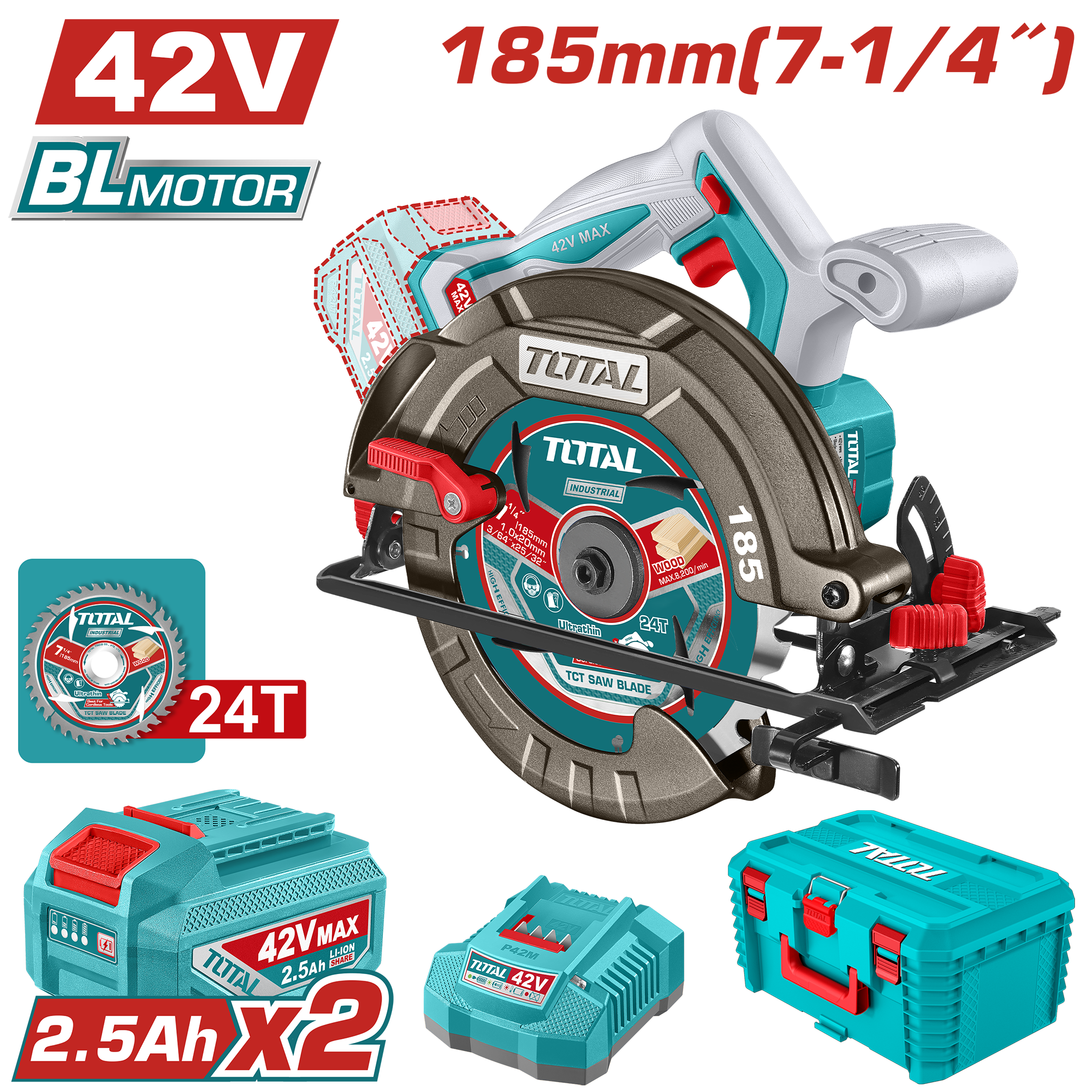 منشار سكل دائري شحن بدون فحمات 42 فولت – شفرة 185 ملم| 7.25 إنش من توتال (TSLI4218512)