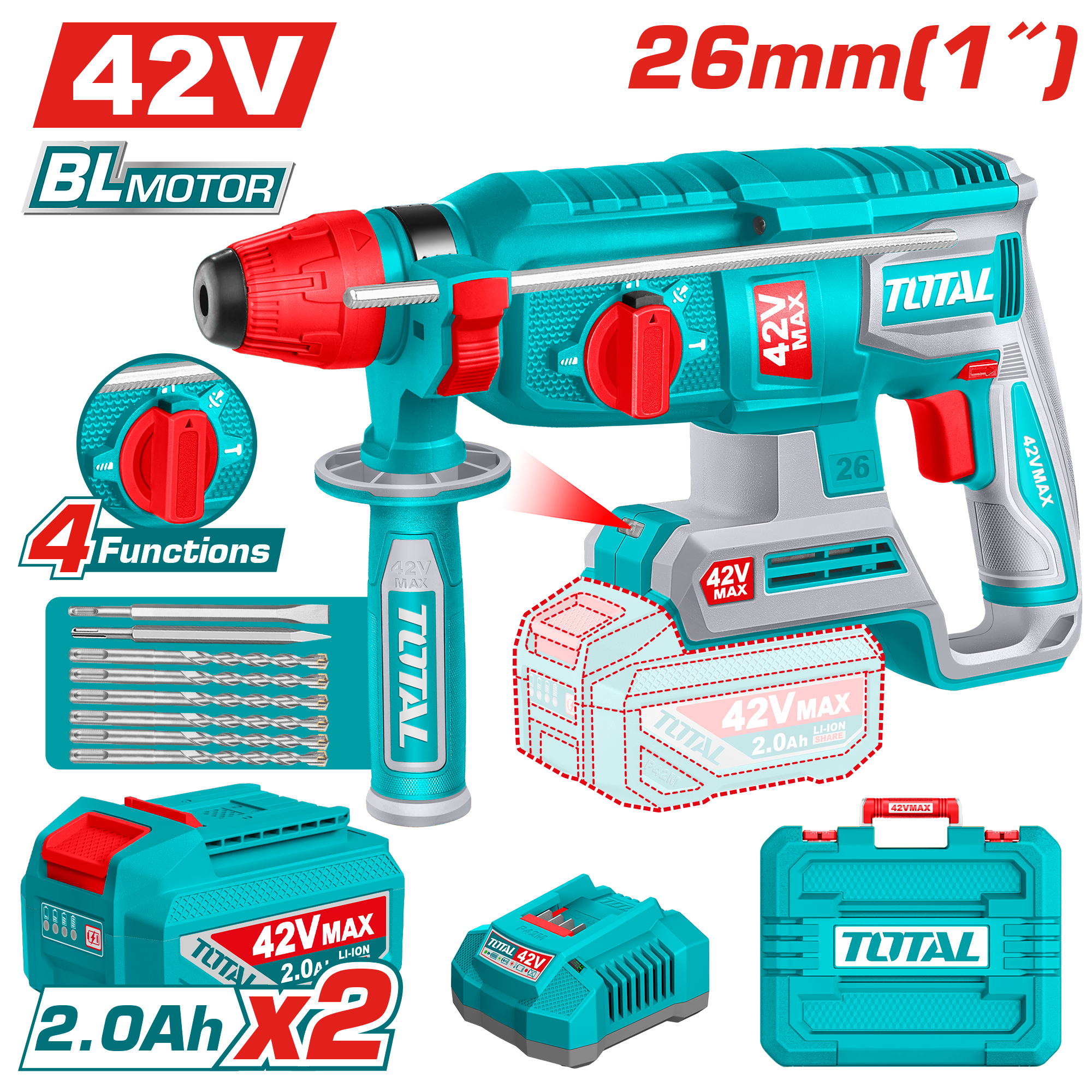 يتميز همر شحن 42 فولت بمحرك بدون فحمات يمنح قوة عالية وكفاءة ممتازة وعمرًا أطول. يوفر طاقة طرق 2.5 جول وسرعة متغيرة من 0 إلى 1100 دورة في الدقيقة مع معدل طرق يصل إلى 5000 نبضة في الدقيقة. مزود بنظام رأس SDS Plus لتبديل اللقم بسهولة وسرعة، كما يحتوي على ضوء LED مدمج للعمل في الأماكن ذات الإضاءة الضعيفة. مثالي للحفر في الخرسانة والفولاذ والخشب.