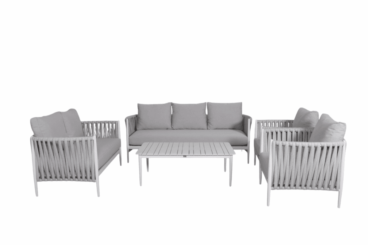 Upgrade your outdoor living space with this elegant 7-Seater Outdoor Lounge Sofa Set, designed for comfort, durability, and modern style. Each piece is built with a rust-free aluminum frame, making the set lightweight yet strong for long-term outdoor use.