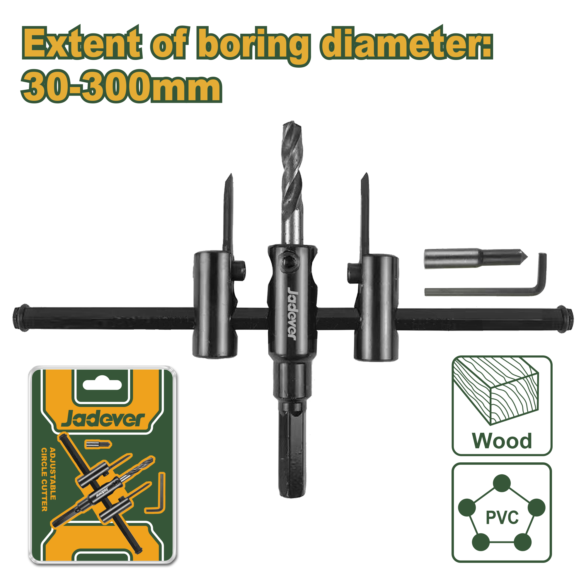 The Adjustable Circle Cutter is a versatile tool ideal for creating precise circular holes in wood, plastic, or soft building materials. It supports a cutting diameter range of 30mm to 300mm and can bore materials up to 50mm thick, making it perfect for carpentry, electrical, and HVAC applications.
