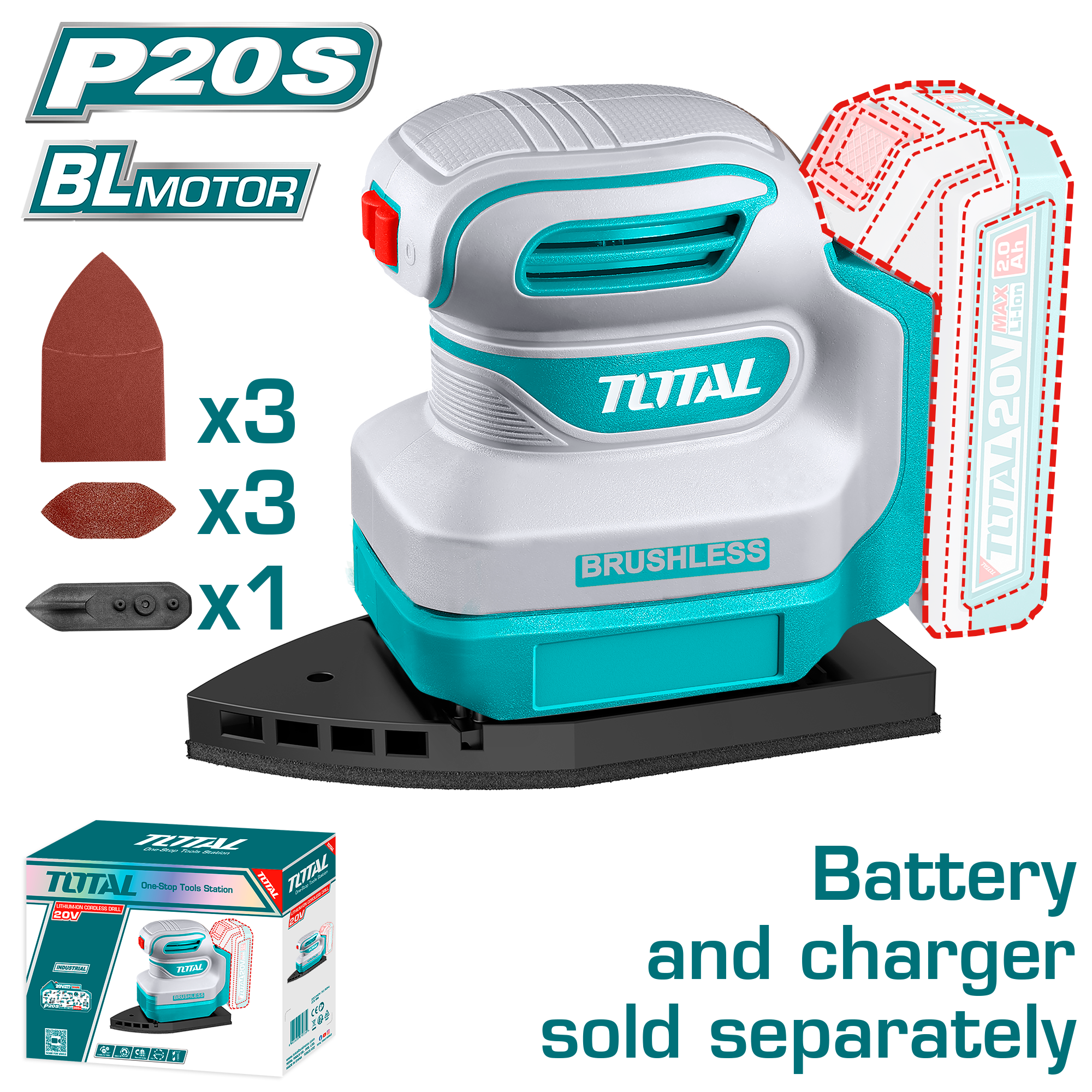 TOTAL 20V Cordless Palm Sander Brushless – 12000rpm with Sanding Pads & Papers (TPSLI2024)