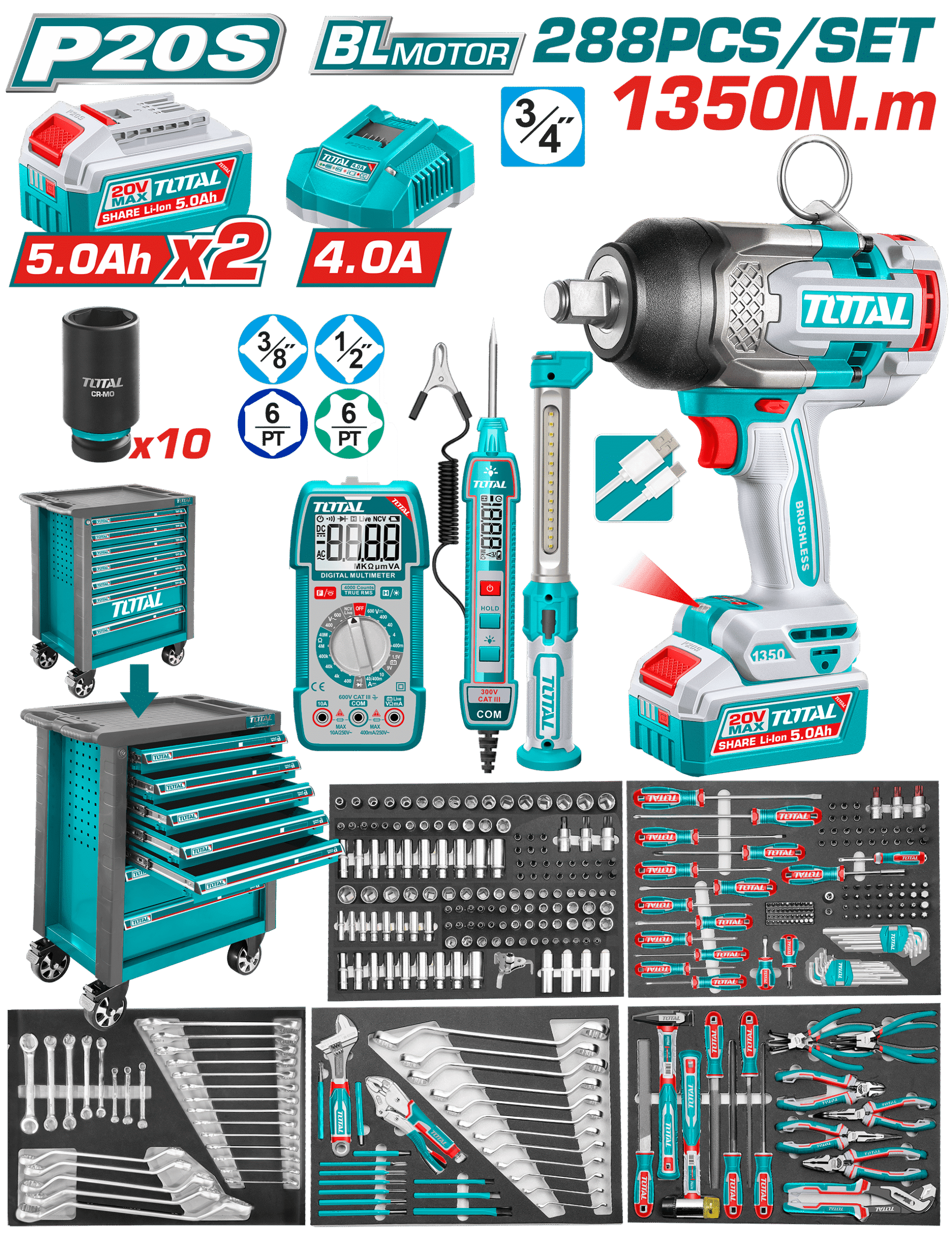 288 Pcs Tool Chest Set is a complete professional-grade workstation designed for garages, workshops, and industrial maintenance. It includes a 20V brushless cordless impact wrench, digital testers, a 7-drawer heavy-duty steel cabinet, and a comprehensive 288-piece tool collection made from premium chrome-vanadium steel for durability and precision. This set ensures full functionality for mechanical, electrical, and maintenance work.