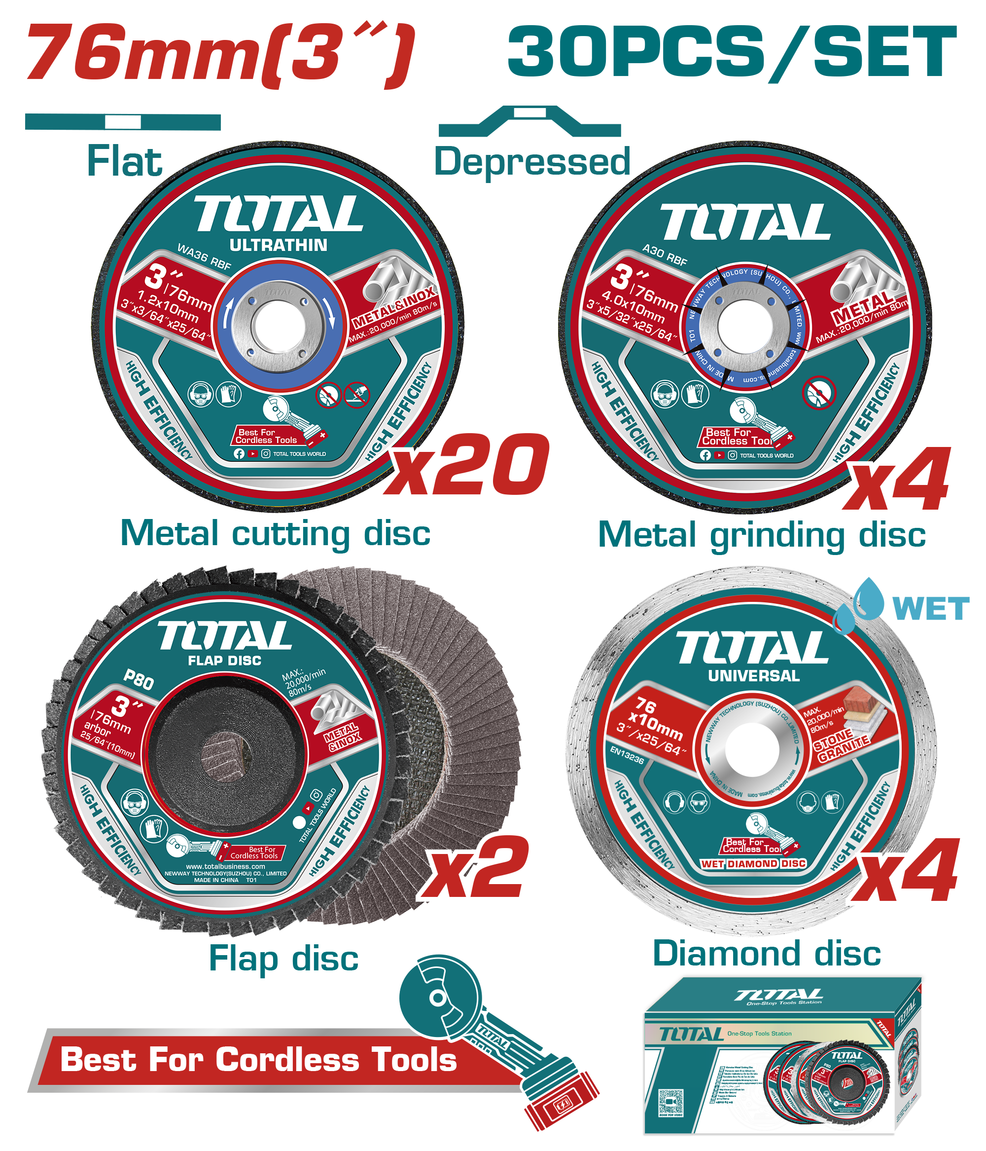 This 30 pcs cutting and grinding disc set is designed for versatile cutting, grinding, and finishing applications on metal and stone. The set includes abrasive cutting discs, grinding discs, wet diamond discs, and flap discs, making it ideal for professional and DIY use. Compatible with compact angle grinders, it delivers reliable performance and precise results.