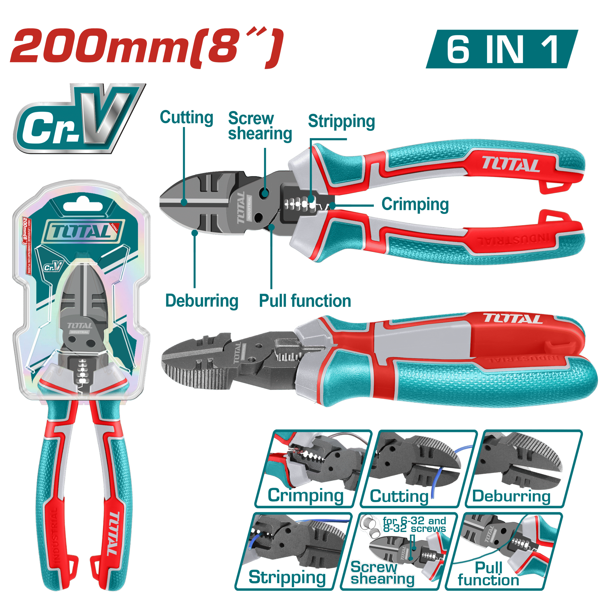 TOTAL 6-in-1 Multi-Function Diagonal Cutting Pliers – 8″ | 200mm, Cr-V, Teflon Coated, Multi-Purpose Design (THTMF386)