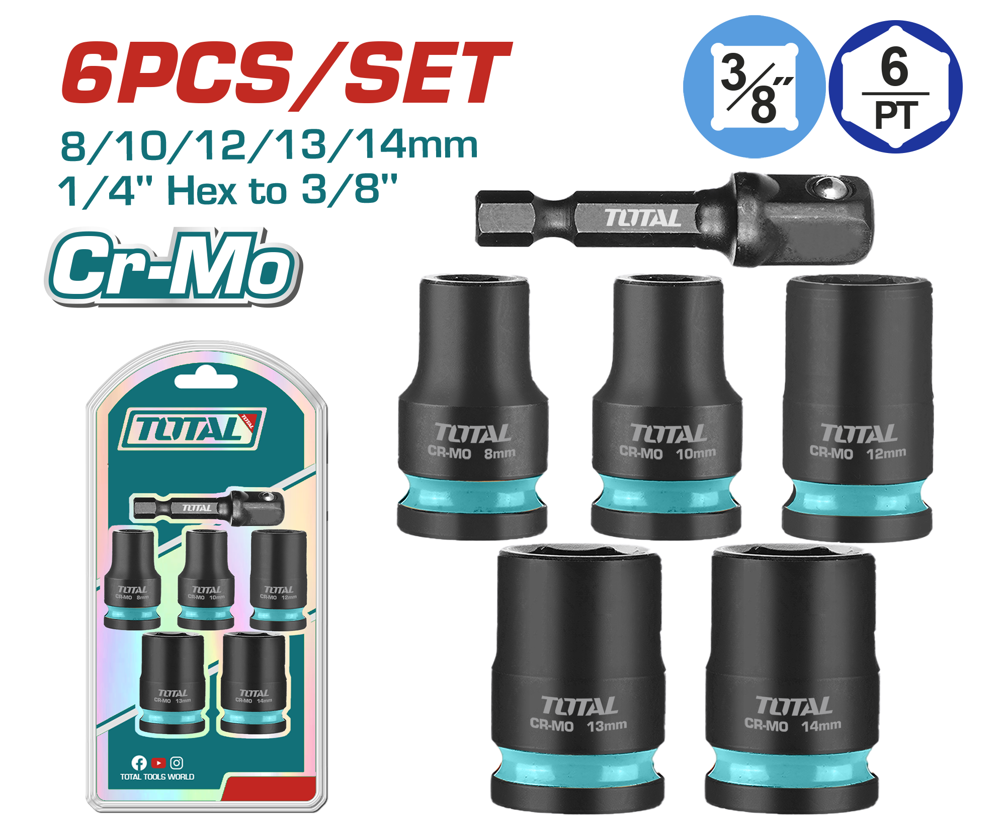 TOTAL 6 Pcs 3/8″DR Impact Socket Set – Cr-Mo, Heat Treated (THKISD38062)