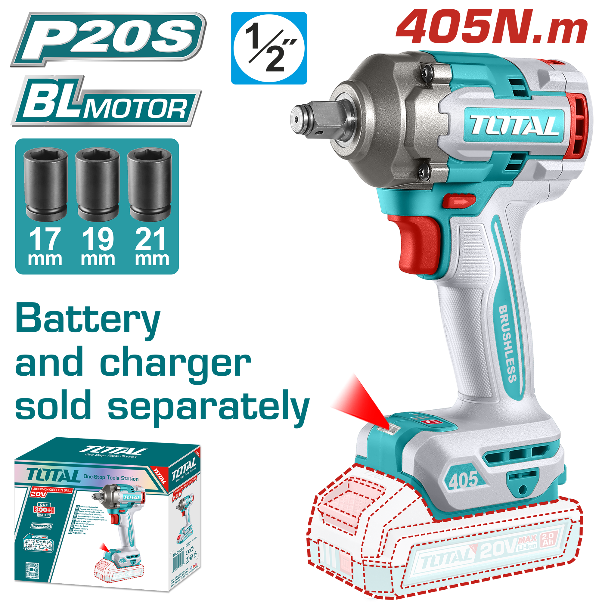 TOTAL Cordless Impact Wrench – Brushless, 1/2″ Drive, 405Nm – Battery & Charger Sold Separately (TIWLI20451)