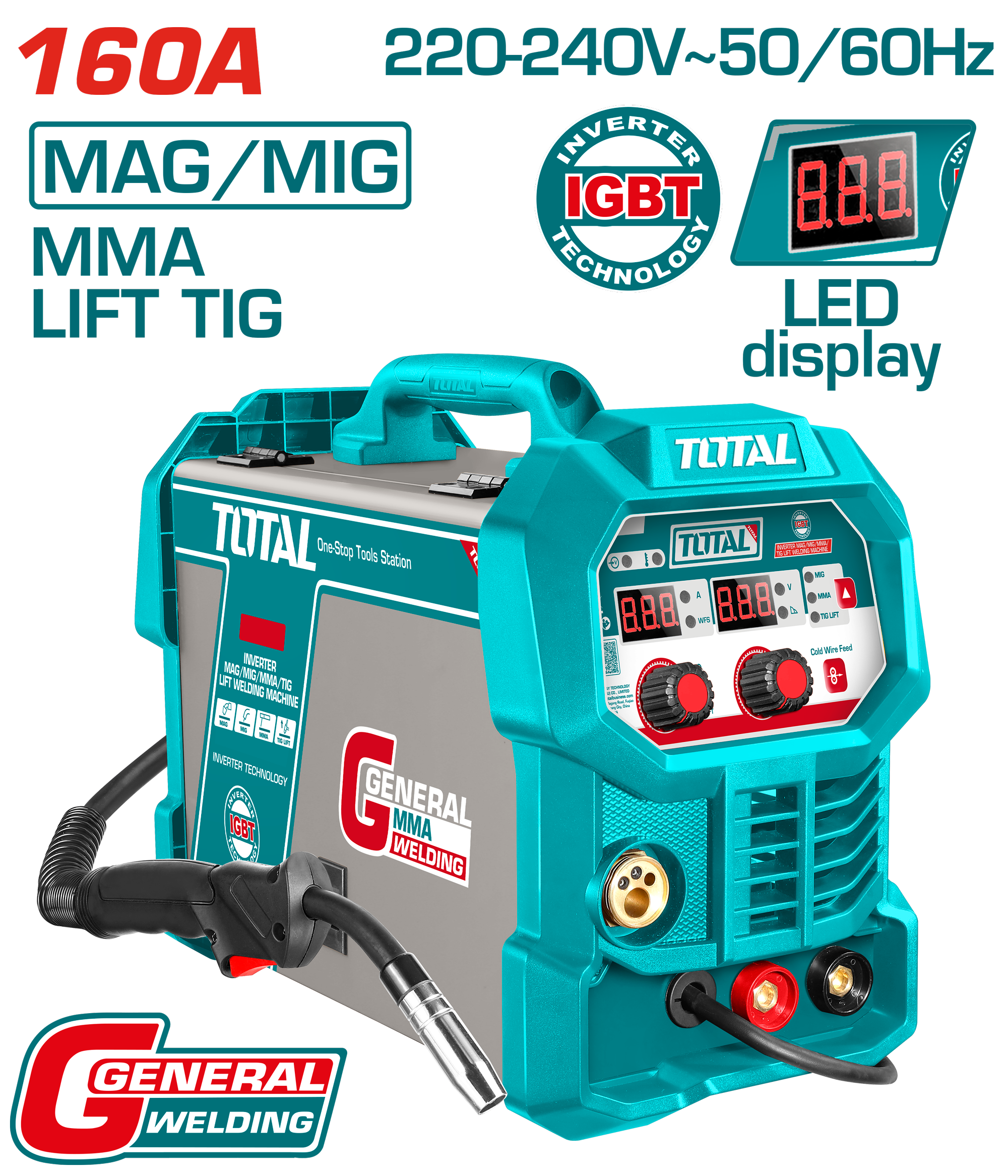 The Inverter MAG/MIG/MMA/TIG Lift Welding Machine is a powerful multi-process welder designed for versatility and high performance in professional and workshop environments. Operating on 1~220–240V input with 50/60Hz frequency, this machine supports MAG, MIG, MMA, and Lift TIG welding, delivering stable arc performance and smooth output across all modes.