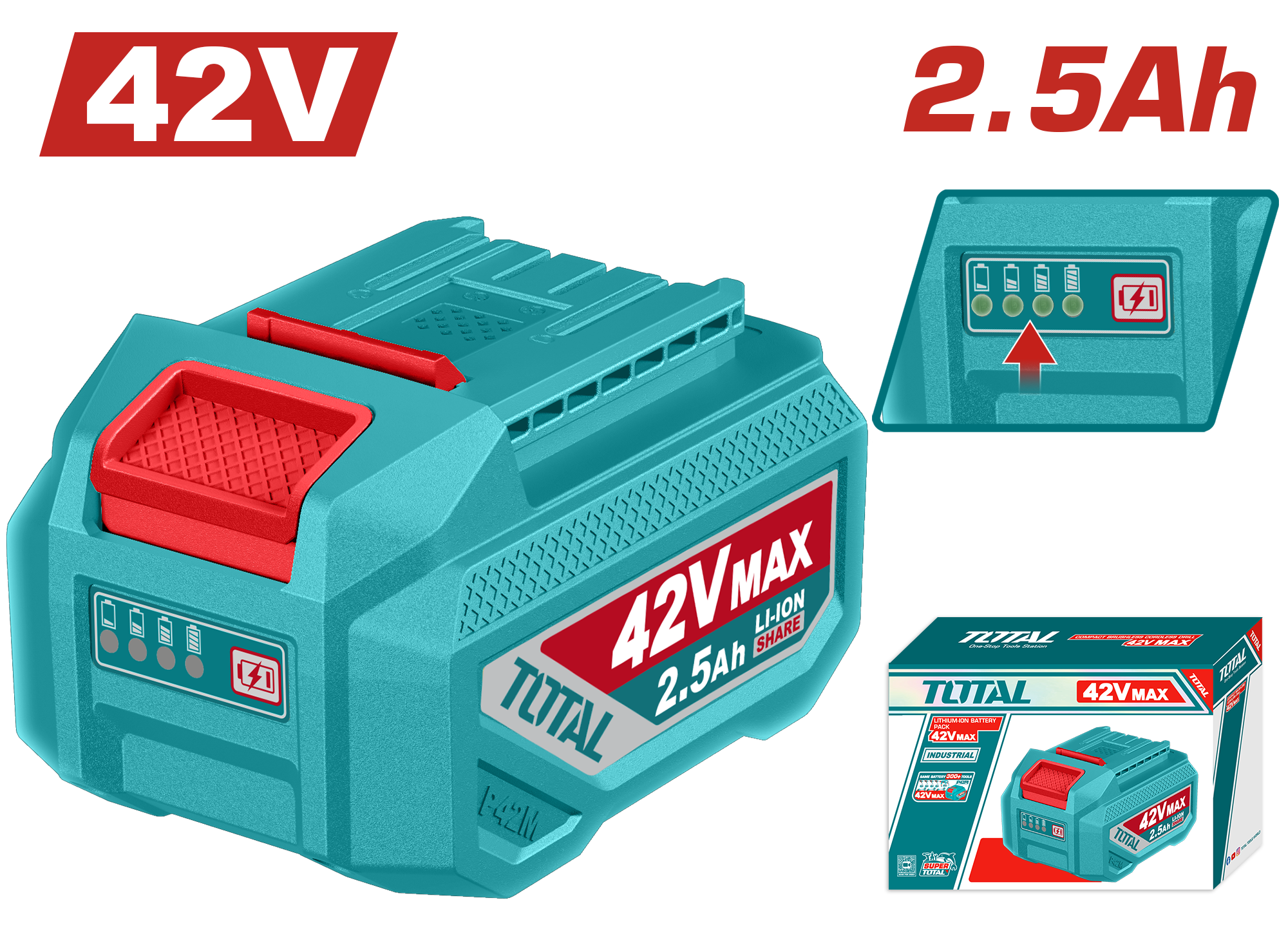 The 42V Lithium-Ion Battery Pack provides reliable power and long runtime for all P42M series cordless tools. With a 2.5Ah capacity, it delivers consistent performance for demanding applications. The built-in LED power indicator allows you to easily monitor charge levels, while its universal design ensures compatibility with all P42M tools. Compact, durable, and efficient, it’s ideal for both professionals and DIY users.