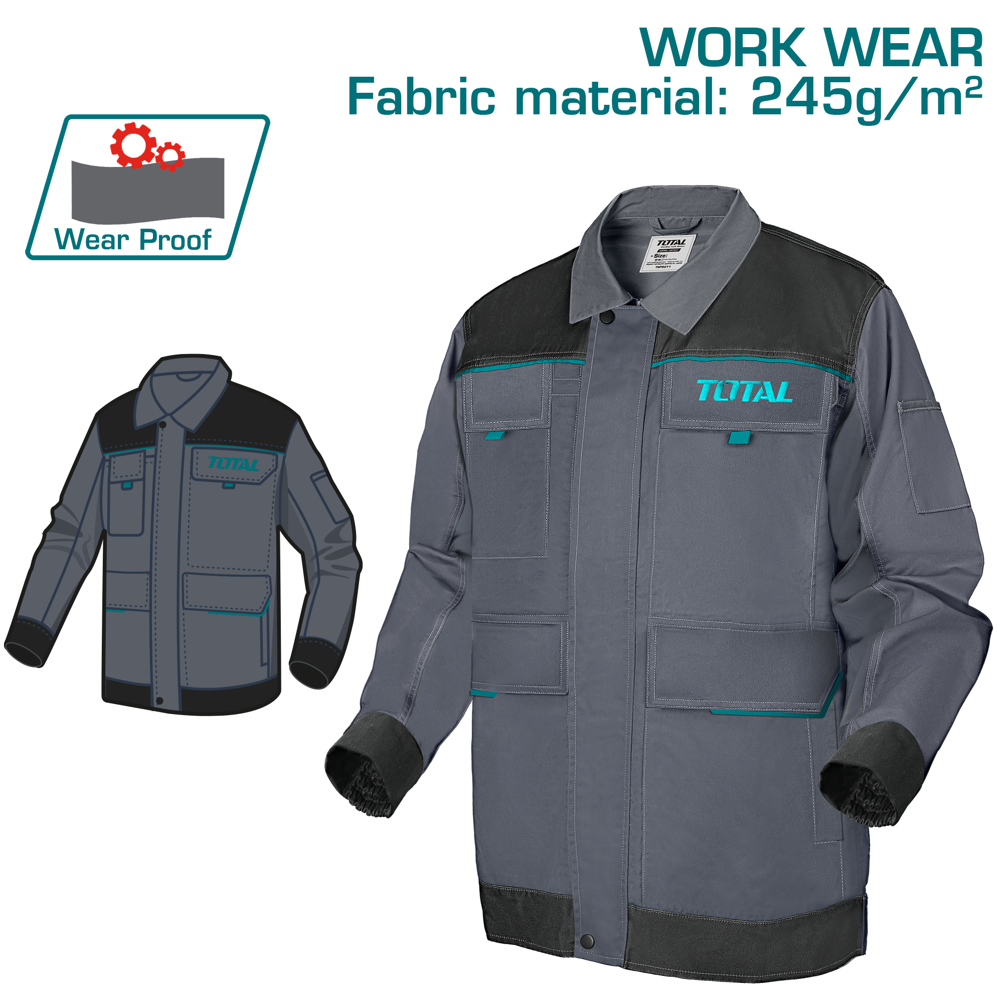 This work jacket is designed for durability, comfort, and practical use in demanding work environments. Made from a strong polyester-cotton fabric, it features multiple functional pockets, reinforced protection areas, and reflective elements for enhanced safety during work.